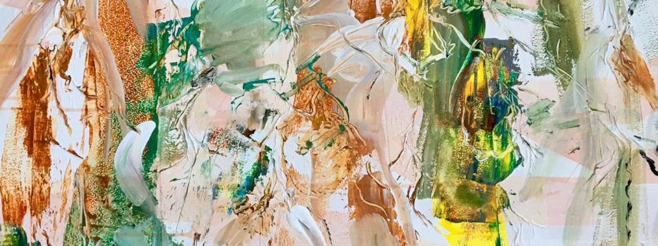 Nichts bleibt wie es ist – dennoch wirkt alles zusammen. Mit jedem Pinselstrich verändert sich das Bild. Der Malprozess entfaltet seine Dynamik im Wechsel zwischen Sichtbarem und Verborgenem.