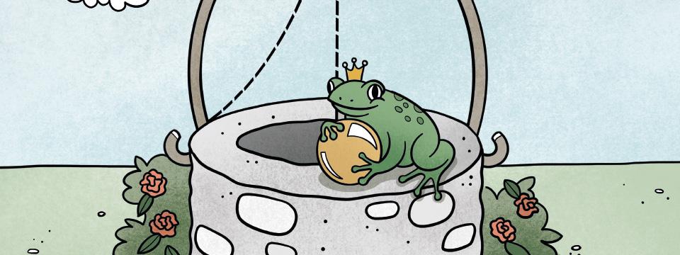 Die hübsche, junge Prinzessin spielt im Schlossgarten mit ihrer goldenen Kugel, die ihr plötzlich aus den Händen gleitet und in den tiefen Schlossbrunnen fällt. Sie ist verzweifelt und weint. Da erscheint wie aus dem Nichts ein Frosch an der Wasseroberfläche und verspricht ihr, die Kugel wieder zu holen, wenn er ihr Freund und Spielkamerad sein darf.